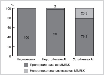 У лиц с верифицированным нормальным АД выявлялась пропорциональная ММЛЖ. При неустойчивой АГ непропорционально высокая ММЛЖ отмечена только у одного обследованного с нормальной геометрией ЛЖ. Феномен непропорционально высокой ММЛЖ выявлен у 16,1% лиц с устойчивой АГ (рис. 2). Случаи непропорционально низкой ММЛЖ отсутствовали.