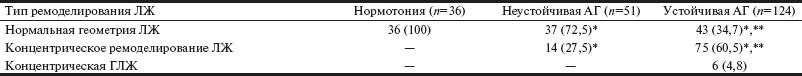 Признаки ремоделирования ЛЖу лиц с подтвержденным нормальным уровнем АД не выявлялись (табл. 4). Концентрическое ремоделирование ЛЖ выявлялось достоверно чаще при устойчивой АГ, чем при неустойчивой. Концентрическая ГЛЖ была выявлена только при устойчивой АГ. Эксцентрической ГЛЖ выявлено не было.