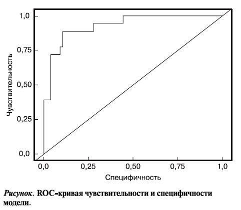 Для проверки нормальности распределения количественных признаков использовали критерий Шапиро— Уилка. Для разработки вероятностной модели применяли метод логистической регрессии. При оценке уравнений регрессии использовали метод пошагового включения предикторов. Для определения операционных характеристик модели проводили ее апробацию на независимой группе больных с расчетом чувствительности и специфичности, ROC-анализ. Статистически значимыми считали различия при p<0,05.