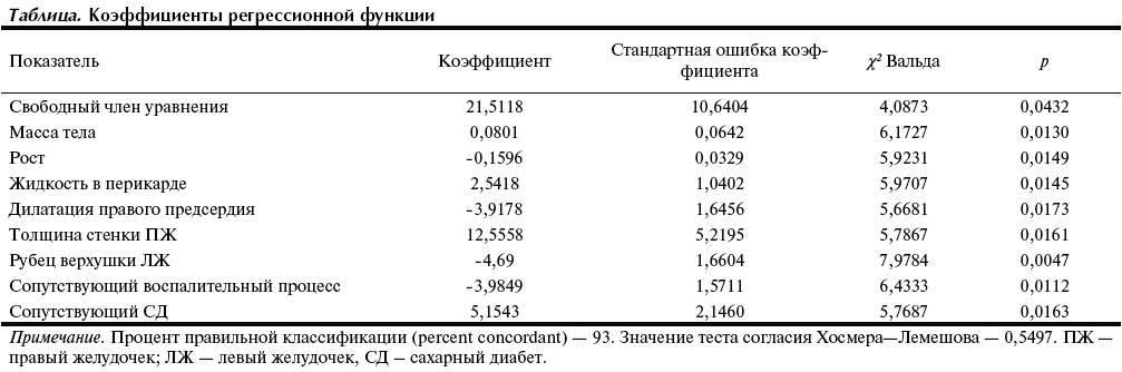 Проанализированы 69 показателей, которые, согласно имеющимся в настоящее время представлениям о тромбообразовании, могут способствовать формированию тромбов в камерах сердца и которые можно определить при жизни больного в общетерапевтическом, общехирургическом стационарах. Учитывали общие данные о пациенте (возраст, масса тела, рост), условия госпитализации (длительность постельного режима и пребывания в стационаре в целом). Анализировали клинические данные: наличие и выраженность хронической сердечной недостаточности; объем поражения русла легочной артерии; рецидивирующее течение тромбоэмболии; нарушения ритма сердца; другие заболевания, которые могли влиять на процесс тромбообразования (сахарный диабет — СД, артериальная гипертония, ИБС, ОНМК, онкологические заболевания, наличие воспалительного процесса). Кроме того, использовали данные о структурных изменениях сердца, полученные при аутопсии. Учитывали массу сердца, дилатацию полостей, изменение митрального, трехстворчатого, аортального клапанов и клапана легочной артерии, толщину стенок ЛЖ и ПЖ, наличие рубцовых изменений стенок ЛЖ и ПЖ, межжелудочковой перегородки и их локализацию, наличие аневризмы и ее локализацию, наличие и локализацию тромбов в сердце. На основании полученных данных с помощью метода логистической регрессии [21, 22] была построена математическая модель — формула для оценки вероятности наличия тромбов в правых полостях сердца. В нее вошли 8 показателей, которые можно определять при обследовании больного в стационаре: масса тела, рост, жидкость в перикарде, дилатация ПП, толщина стенки ПЖ, рубец верхушки ПЖ и ЛЖ, сопутствующий воспалительный процесс, сопутствующий СД. Следует подчеркнуть, что такие показатели, как жидкость в перикарде (есть/нет), дилатация ПП (есть/нет), толщина стенки ПЖ (в сантиметрах), рубец верхушки ЛЖ (есть/нет), можно определять по данным ЭхоКГ в сочетании с результатами ЭКГ и анамнезом [13]. Рассчитанные коэффициенты уравнения логистической регрессии представлены в таблице.