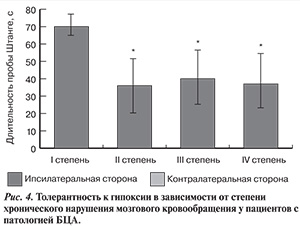 Показатели пробы на устойчивость головного мозга к гипоксии также различаются в зависимости от степени сосудисто-мозговой недостаточности (рис. 4).