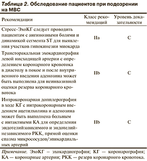 В 2013 г. впервые в европейские рекомендации по ведению больных стабильными формами ИБС [59] включен раздел, посвященный МВС. Для верификации диагноза МВС в алгоритм обследования необходимо включить стресс-ЭхоКГ для выявления участков гипокинеза миокарда, трансторакальную или интракоронарную допплер-ЭхоКГ с фармакологическими пробами (аденозин, добутамин) для оценки РКК (табл. 2).