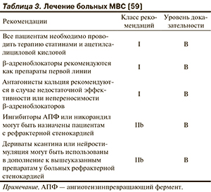 Необходимо обратить внимание, что ответ на терапию β-адреноблокаторами (уменьшение числа эпизодов ангинозных болей) варьируется в широких пределах (19—60%) [67], поэтому при лечении МВС часто возникает необходимость прибегать к комбинированной терапии, препаратами выбора при этом являются антагонисты кальция и нитраты.