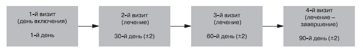 Продолжительность программы составляла 3 мес, в течение которых должно было состояться 4 визита в центр. На протяжении всего исследования пациентам разрешалось принимать другие антигипертензивные препараты, в случае необходимости с учетом сопутствующих заболеваний и для купирования криза, если таковой отмечался.