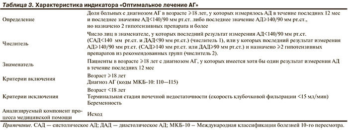 Объектом исследования послужили 2 индикатора: индикатор Российского регистра АГ «Достижение и поддержание целевого АД» и адаптированный для данных Российского регистра показатель, обобщающий условия индикаторов NQF, ACC/AHA и NICE, — «Оптимальное лечение АГ». Характеристики анализируемых индикаторов приведены в табл. 2 и 3.