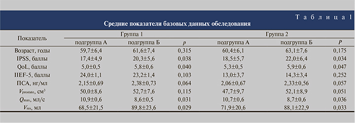 Пациенты были разделены на две группы. Группу 1 составили пациенты с ДГПЖ без ЭД (>21 балла по анкете IIEF-5), группу 2 – мужчины с ДГПЖ и ЭД (≤21 балла по анкете IIEF-5). Внутри каждой группы выделены две подгруппы: подгруппа А – пациенты со слабовыраженной обструктивной симптоматикой (Qmax>10 мл/с); подгруппа Б – пациенты с выраженной обструктивной симптоматикой (Qmax≤10 мл/с). Пациенты подгруппы А группы 1 получали ингибитор 5α-редуктазы, подгруппы Б группы 1 – α1-адреноблокатор и ингибитор 5α-редуктазы, подгруппы А группы 2 – ингибитор 5α-редуктазы и ингибитор фосфодиэстеразы 5-го типа (ФДЭ-5), подгруппы Б группы 2 – α1-адреноблокатор, ингибитор 5α-редуктазы и ингибитор ФДЭ-5. При указанных режимах фармакотерапии из α1-адреноблокаторов использован тамсулозин в дозе 0,4 мг ежедневно в течение 12 мес., ингибиторов 5α-редуктазы – дутастерид в дозе 0,5 мг ежедневно в течение 12 мес., ингибиторов ФДЭ-5 – силденафил в дозе 25 мг «по требованию» в течение 12 мес.