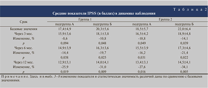 Среди пациентов группы 1 улучшение СНМП в виде достоверного снижения показателя IPSS наступило при первом контрольном обследовании, т.е. через 3 мес. лечения, тогда как монотерапия ингибитором 5α-редуктазы обеспечила такой результат через 6 мес. терапии. В обеих подгруппах пациентов группы 2 отмечено статистически значимое уменьшение показателя IPSS на первом контрольном визите (табл. 2). Вероятно, дополнительное включение в схему лечения ингибитора ФДЭ-5, положительно влияющего на течение СНМП, привело к такому эффекту в более ранние сроки, чем у аналогичной подгруппы А пациентов группы 1.