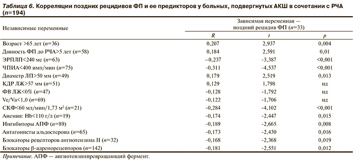 Анализ причин поздних рецидивов ФП спустя 12 мес после операции выявил корреляции с известными предикторами ФП (табл. 6). В частности, поздний рецидив ФП тесно ассоциировался с возрастом старше 65 лет, давностью ФП более 5 лет, ЭРПЛП<240 мс, ЧПИА<400 имп/мин, СКФ<60 мл/мин/1,73 м2.