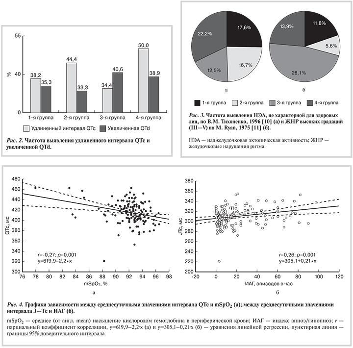 Таким образом, при сравнении групп пациентов, сопоставимых по возрасту, ИМТ, СКФ и ИММЛЖ, выявлены некоторые особенности динамики изучаемых показателей у больных с ИАГ 30/ч и более. Во-первых, наблюдались более частые эпизоды десатурации и, как следствие, более низкие показатели гипоксемии во время сна. Во-вторых, чаще отмечались пароксизмы наджелудочковой тахикардии и ускоренные наджелудочковые ритмы, а также нарушения суточного профиля АД. В-третьих, регистрировалась более высокая ЧСС наряду с более продолжительными интервалами QTc и J—Tc за сутки, периоды сна и бодрствования. В-четвертых, прослеживалась тенденция к более высокой частоте выявления удлиненного интервала QTc и увеличенной QTd.