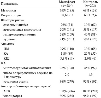 Характеристика больных, включенных в исследование, представлена в табл. 1. Достоверных различий между контрольной группой и группой монафрама не было зафиксировано ни по одному из таких показателей, как возраст, пол, факторы риска, анамнез. Не было различий и по параметрам, характеризующим проведение КА, а также по числу больных, которым проводилась пластика 2 сосудов и более (многососудистая КА) — 38 и 45% в контрольной группе и группе монафрама соответственно. В среднем в обеих группах в течение одной процедуры проводилась пластика 2 сосудов. Установка стентов была проведена практически во всех оперированных сосудах — 98 и 95% в контрольной группе и группе монафрама соответственно.
