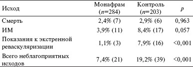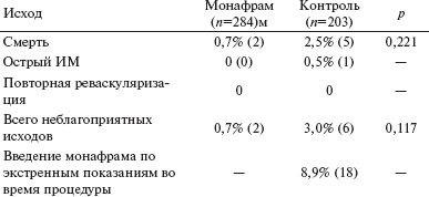 Число острых тромбозов в течение первых 3 дней после процедуры было достаточно низким — 3,0% (у 6 из 203 больных) и 0,7% (у 2 из 284 больных) соответственно в группе контроля и группе монафрама (см. табл. 2). Несмотря на то что при применении монафрама их частота была более чем в 3 раза ниже, в связи с небольшим количеством таких случаев различия были недостоверными (р=0,117). Большая часть острых тромбозов закончилась развитием ИМ с летальным исходом — умерли оба больных в группе монафрама и 5 из 6 больных в контрольной группе. Кроме того, у одного больного в контрольной группе развился нефатальный ИМ. Необходимо отметить, что у 18 из 203 (8,9%) больных в группе сравнения, несмотря на то что исходно ангиопластика осуществлялась без введения монафрама, этот препарат был введен во время процедуры по экстренным показаниям, к которым относили внутрисосудистый тромбоз и значимые механические повреждения артерий. Можно предположить, что без применения в этих случаях монафрама число острых тромбозов, приведших к развитию ИМ, в контрольной группе могло быть существенно больше.