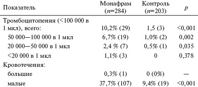 Побочные эффекты и осложнения после применения монафрама. Препарат хорошо переносился всеми больными. Ни у одного из них не было признаков индивидуальной непереносимости, таких как повышение температуры тела, артериального давления и др. Ни у одного больного также не было аллергических реакций на введение препарата. Тромбоцитопения была наиболее частым побочным эффектом при применении монафрама — уменьшение числа тромбоцитов до уровня менее 100 000 в 1 мкл было зарегистрировано у 10% больных. Однако глубокая тромбоцитопения с уменьшение числа тромбоцитов менее 50 000 в 1 мкл развилась лишь у 10 из 284 (3,5%) больных, из которых у 3 (1,1%) число тромбоцитов уменьшилось до менее 20 000 в 1 мкл (табл. 4). Большинству больных с тромбоцитопенией менее 50 000 в 1 мкл проводилось переливание тромбоцитной массы (до 4 доз максимально). Тромбоцитопения во всех случаях имела преходящий характер, и количество тромбоцитов нормализовалось полностью в течение 7 дней после введения препарата.
