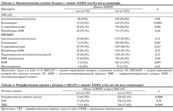 В плане медикаментозной терапии пациенты с «новой» БЛНПГ независимо от вида ОКС (ОКСпST или ОКСбпST) достоверно реже получали терапию клопидогрелом, β-адреноблокаторами, нефракционированным и низкомолекулярным гепаринами (табл. 2). Наиболее значимо это было в отношении клопидогрела. Так, пациенты, отнесенные к группе ОКСпST, имели возможность получать его в 2 раза реже (34,9% против 70,5%), а в группе ОКСбпST почти в 3 раза реже (15,9% против 40,5%).
