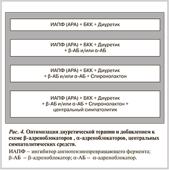 Следующей ступенью является оптимизация диуретической терапии, как отмечено выше, и добавление к схеме препаратов с другим механизмом действия — β-адреноблокаторов, α-адреноблокаторов, центральных симпатолитических средств (моксонидин, рилменидин) (рис. 4). Достаточно перспективной и не запрещенной комбинацией для преодоления резистентности может быть сочетание блокаторов кальциевых каналов с различными механизмами действия — дигидропиридиновые (нифедипин и амлодипин) и недигидропиридиновые (верапамил, дилтиазем), особенно при наличии противопоказаний к применению β-адреноблокаторов. Показания к назначению препаратов из вспомогательных классов определяются врачом в соответствии с клиническим портретом пациента (клинико-функциональные характеристики АГ, сочетанные и сопутствующие заболевания).