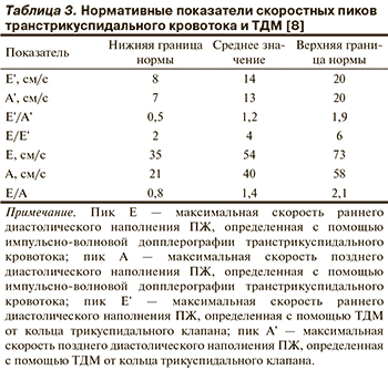 Для оценки систолической функции ПЖ производится измерение систолического пика (S′). При анализе данных 43 различных исследований, включающих в общей сложности более 2000 человек, установлено, что систолическую дисфункцию ПЖ можно констатировать при снижении S′< 10 см/с [8]. Диастолическая функция ПЖ, по данным ТДМ, определяется на основании измерения пиков Е′ и А′, а также их соотношения с пиками транстрикуспидального кровотока. В табл. 3 представлены данные, полученные в ходе последних исследований, касающихся диастолической функции миокарда ПЖ.