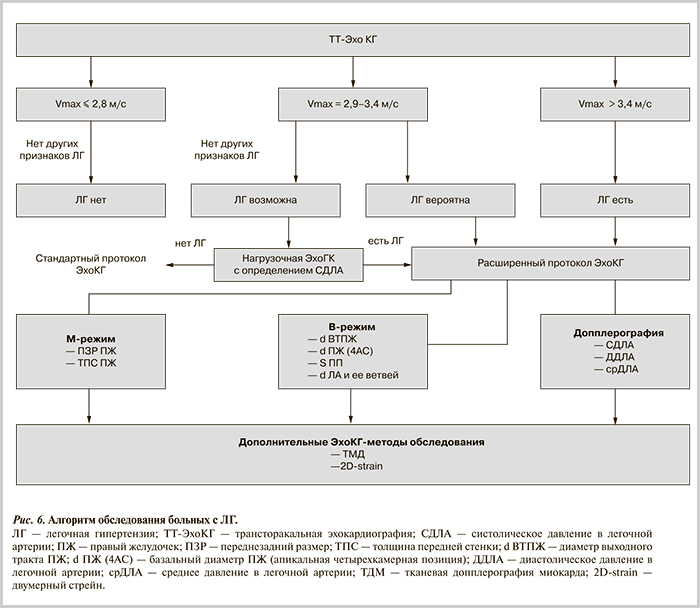 Сегодня же мы предлагаем алгоритм эхокардиографического обследования больных в зависимости от степени выраженности легочной гипертензии (рис. 6). Небольшое повышение скорости или систолического градиента давления на трикуспидальном клапане еще не означает однозначно наличие у больного повышения давления в легочной артерии. В отсутствие других признаков легочной гипертензии рекомендовано проведение нагрузочной эхокардиографии с определением систолического давления в легочной артерии при нагрузке. Подтверждение высокого систолического давления в легочной артерии, а также наличие у больного в покое выраженной легочной гипертензии обусловливает необходимость применения расширенного эхокардиографического протокола для уточнения стадии заболевания и в дальнейшем оценки эффективности проводимого лечения. Исследование правого и левого желудочков сердца с использованием дополнительных эхокардиографических технологий может помочь в определении параметров компенсации патологического процесса.