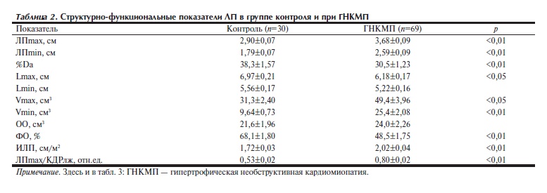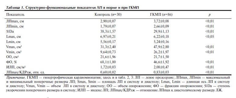 Первоначально было проведено сравнение между группой контроля и общей группой больных ГКМП (n=86) по основным структурно-функциональным показателям ЛП (табл. 1).