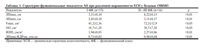 Таблица 3. Структурно-функциональные показатели ЛП при различной выраженности ХСН у больных ГНКМП.