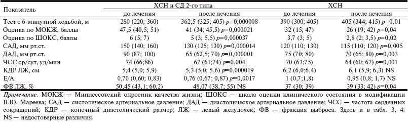 Об увеличении толерантности больных к физическим нагрузкам свидетельствует также достоверное увеличение расстояния, пройденного в тесте с 6-минутной ходьбой, в обеих группах. Больший прирост физической работоспособности был выявлен у пациентов без сопутствующего СД 2-го типа (табл. 2).