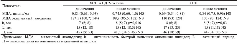 Динамика показателей окисления липидов представлена в табл. 3. Исходные уровни МДА в обеих группах не превышали норму, однако на фоне терапии у больных СД 2-го типа отмечалась тенденция к уменьшению его уровня, что свидетельствует о возможном снижениии концентрации вторичных продуктов окисления и об уменьшении предрасположенности липидов к окислению. Такого эффекта не было выявлено в группе пациентов без СД 2-го типа.