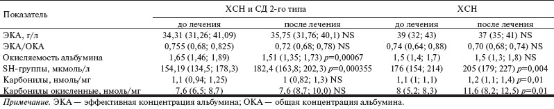 За время наблюдения достоверно снизился уровень окисляемости альбумина в группе больных с СД 2-го типа, что может свидетельствовать об увеличении окислительной резистентности плазмы.