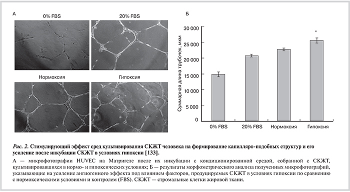 Они также характеризуются активной продукцией ряда АФР и белков, участвующих в паракринной регуляции тканевого гомеостаза и регенерации тканей [132]. Результаты наших исследований и работы других групп указывают на то, что при гипоксическом прекондиционировании СКЖТ резко увеличивается продукция ими АФР (рис. 2) и это позволяет использовать данные метод для повышения терапевтического потенциала препаратов на основе сред культивирования [95].
