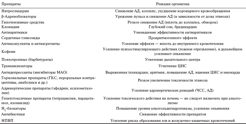 Таблица 2. Взаимодействие алкоголя с лекарственными препаратами.