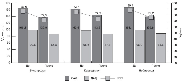 Монотерапия бисопрололом, небивололом и карведилолом в течение 2 мес приводила к достоверному снижению систолического АД (САД), ДАД, а также к снижению ЧСС (р<0,001) (см. рисунок).