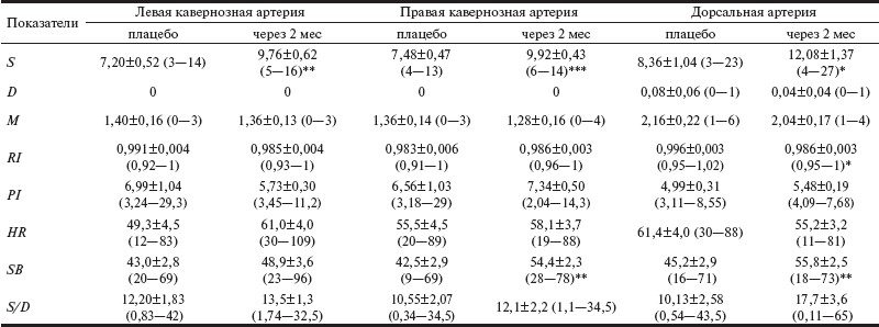 Монотерапия изучаемыми β-адреноблокаторами приводила к статистически значимому повышению S в кавернозных и дорсальной артериях (табл. 3—5), что сопровождалось достоверным улучшением показателей SB, RI, PI, S/D.