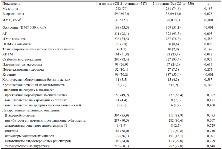 Общая характеристика пациентов представлена в табл. 1. Более чем у 50% пациентов с СД имелось ожирение, в то время как во 2-й группе ожирением страдали лишь 1/3 больных (p<0,001). Распространенность и длительность АГ была выше у пациентов с СД (p<0,05). У них же отмечена более высокая распространенность хронической ишемии головного мозга (p=0,012). Пациенты в сравниваемых группах перед операцией КШ одинаково часто получали β-адреноблокаторы, ингибиторы ангиотензинпревращающего фермента, статины, ацетилсалициловую кислоту (р>0,05).