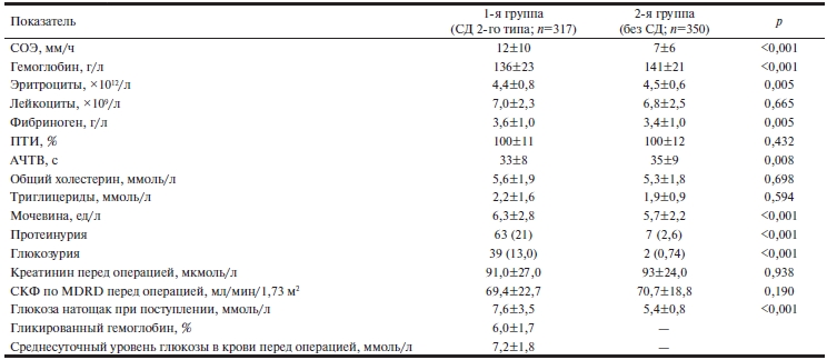 При анализе предоперационных лабораторных данных у пациентов с СД выявлена более высокая скорость оседания эритроцитов (СОЭ) и более низкие медианы уровня эритроцитов и гемоглобина (р<0,05), тем не менее находившиеся в пределах референсных значений (табл. 2). В то же время в группе СД медиана уровня фибриногена была статистически значимо выше (р=0,005), а частичное активированное тромбопластическое время — меньше, чем у пациентов без СД (р=0,008).