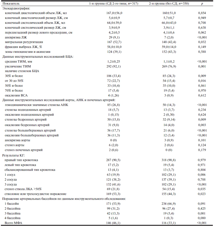 При анализе результатов инструментального исследования всех артериальных бассейнов МФА выявлялся у 46,1% пациентов с СД и у 33,1% пациентов без СД 2-го типа (р<0,001). Поражение одного (только коронарного) артериального бассейна чаще выявлялось у пациентов без СД 2-го типа (р=0,0001). Максимальное число пораженных артериальных бассейнов (3 и 4) наблюдалось значимо чаще (р<0,001) в группе СД.