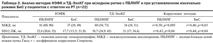 При анализе динамики показателя МЖД, измеренного методом ТД-ЭхоКГ, значения на фоне БиС по сравнению с ПБЛНПГ были статистически значимо меньше — 34 (24; 51) мс и 60 (54; 73) мс соответственно (p<0,001). Показатель SD12 при БиС по сравнению с ПБЛНПГ методом ТД-ЭхоКГ также был статистически значимо меньше — 21 (17; 34,4) мс и 38,7 (24,9; 45) мс соответственно (p=0,001; см. табл. 3). Таким образом, методики НЭФК и ТД-ЭхоКГ являются сопоставимыми при анализе электрофизиологических данных у пациентов с СРТ.