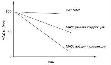 Рисунок 3. Влияние своевременности назначения нефропротективной лекарственной терапии на прогноз фильтрационной способности почек у больных СД с МАУ [по R.T. Gansevoort, P.E. de Jong, 2009].