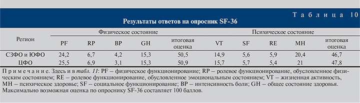 Итоговые оценки результатов обработки ответов пациентов по регионам и центрам на вопросы опросника SF-36 приведены в табл. 10.