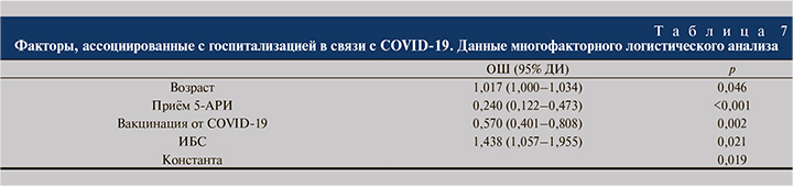 На основании проведенного анализа построена модель, включившая факторы, значимо отличавшиеся между госпитализированными и не госпитализированными по поводу COVID-19 пациентами. Результаты представлены в табл. 6. Прием 5-АРИ и вакцинация от COVID-19 ассоциировались с меньшими шансами госпитализаций независимо друг от друга. Так, при приеме 5-АРИ вероятность госпитализации снижалась на 76% (ОШ=0,240; 95% ДИ: 0,122-0,473; p<0,001). Аналогичным образом и вакцинация ассоциируется с меньшими шансами госпитализации на 43% (ОШ=0,570; 95% ДИ: 0,401–0,808; p=0,002). Факторы, ассоциированные с большим риском госпитализации в связи с тяжелым течением CОVID-19: наличие сопутствующей ИБС (+43,8%, р=0,019) и больший возраст (+1,7% при увеличение возраста на год, р=0,046).